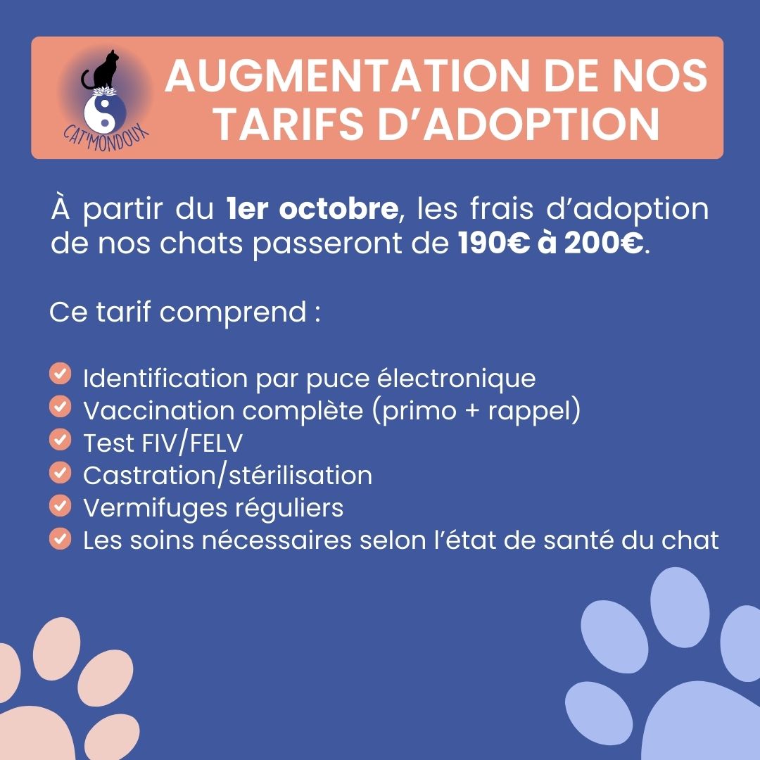 MODIFICATION DE NOTRE TARIF D’ADOPTION À partir du 1er octobre, les frais d’adoption de nos chats passeront de 190€ à 200€. Pourquoi cette augmentation ? 🔹 Parce que nous n’avons pas revu notre tarif depuis plus de 4 ans, 🔹 Parce que les frais vétérinaires ont beaucoup augmenté, 🔹 Parce que les frais d’adoption couvrent toujours bien moins que les réels coûts de prise en charge d’un chat. Pour rappel, une adoption chez Cat’MonDoux comprend toujours : ✅ Identification par puce électronique ✅ Vaccination complète (primo + rappel) ✅ Test FIV/FELV ✅ Castration/stérilisation ✅ Vermifuges réguliers ✅ Et tous les soins nécessaires selon l’état de santé du chat accueilli 👉 En clinique, pour un particulier, ces actes de base représentent en moyenne 350 à 550€ (sans soins). Pour l’association, le coût moyen d’un chat (malgré les tarifs préférentiels appliqués par nos cliniques partenaires) est de 220-250€ (hors frais supplémentaires liés aux blessures, maladies ou soins particuliers). 👉 Une adoption à 200€ ne couvre donc jamais totalement les frais engagés, mais permet d’alléger une partie des dépenses pour continuer à sauver d’autres chats.